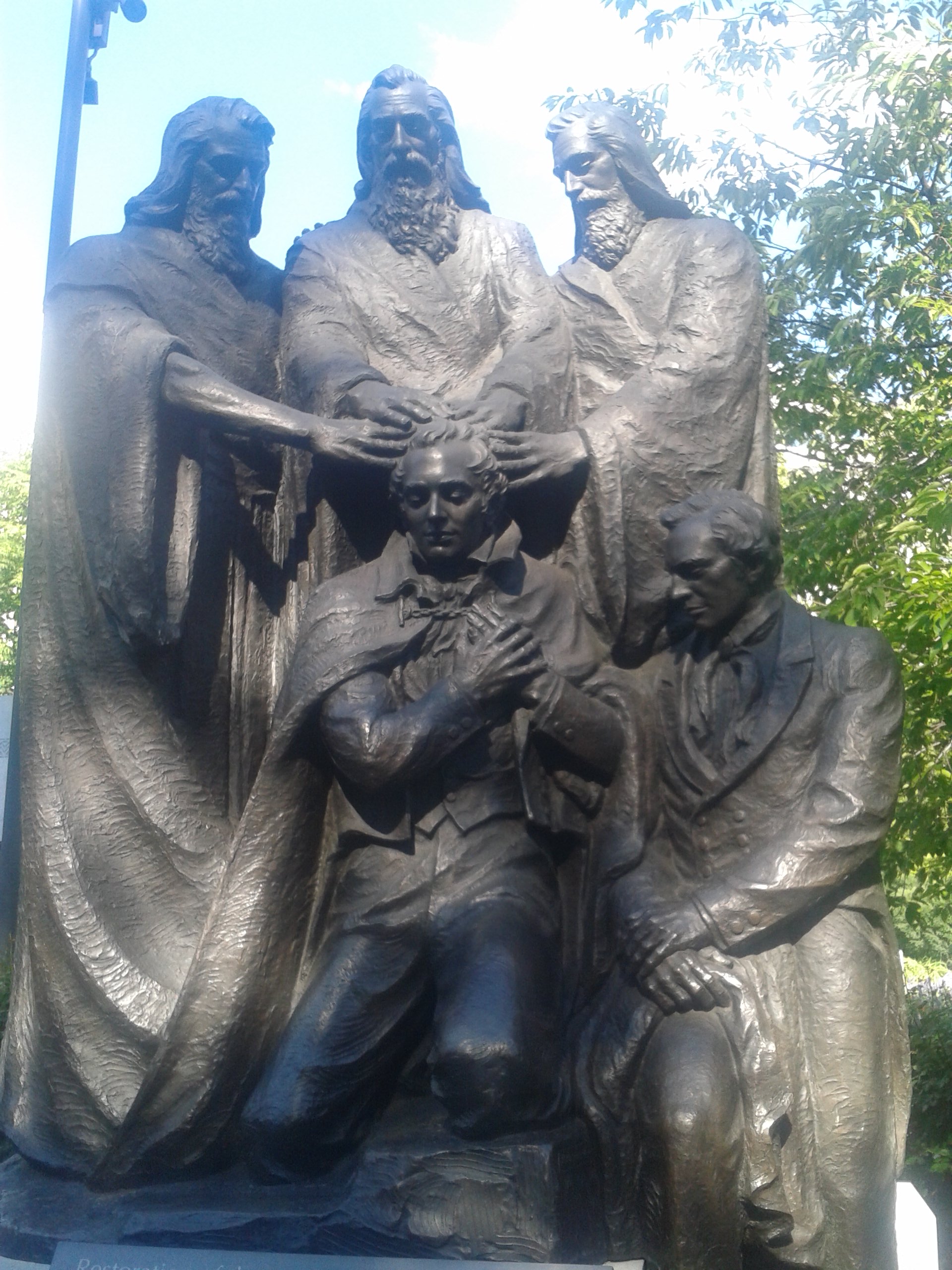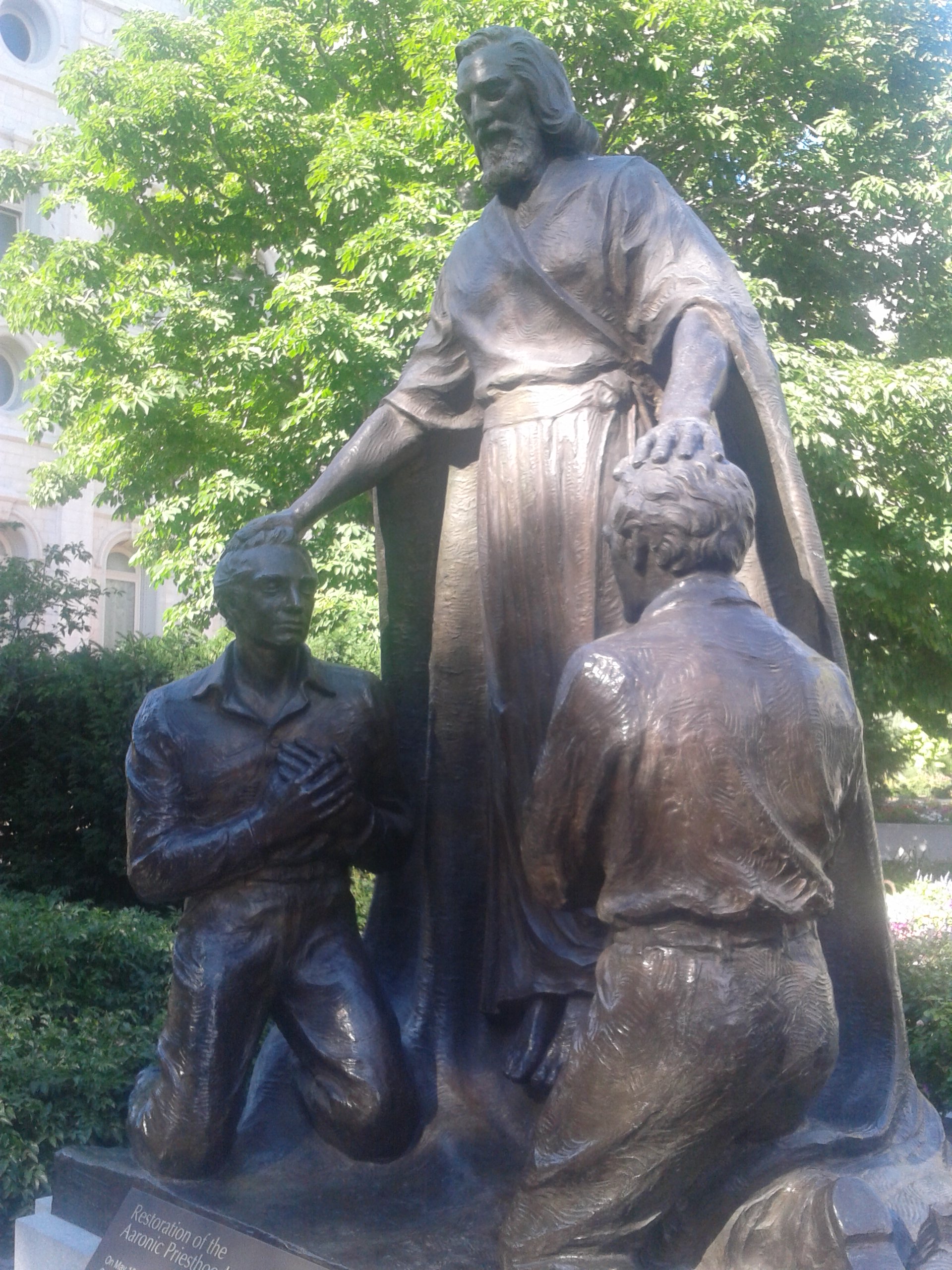A statue in Temple Square in Salt Lake City depicting the moment LDS founders Joseph Smith & Oliver Cowdery went into the woods in the of Spring of 1829 and were greeted with the angel of John The Baptist come from Heaven to bestow upon them the power of absolving sins through baptism…I’m sure there were plenty of historical witnesses and I’m doubly sure John came down in that bitchin’ tunic.