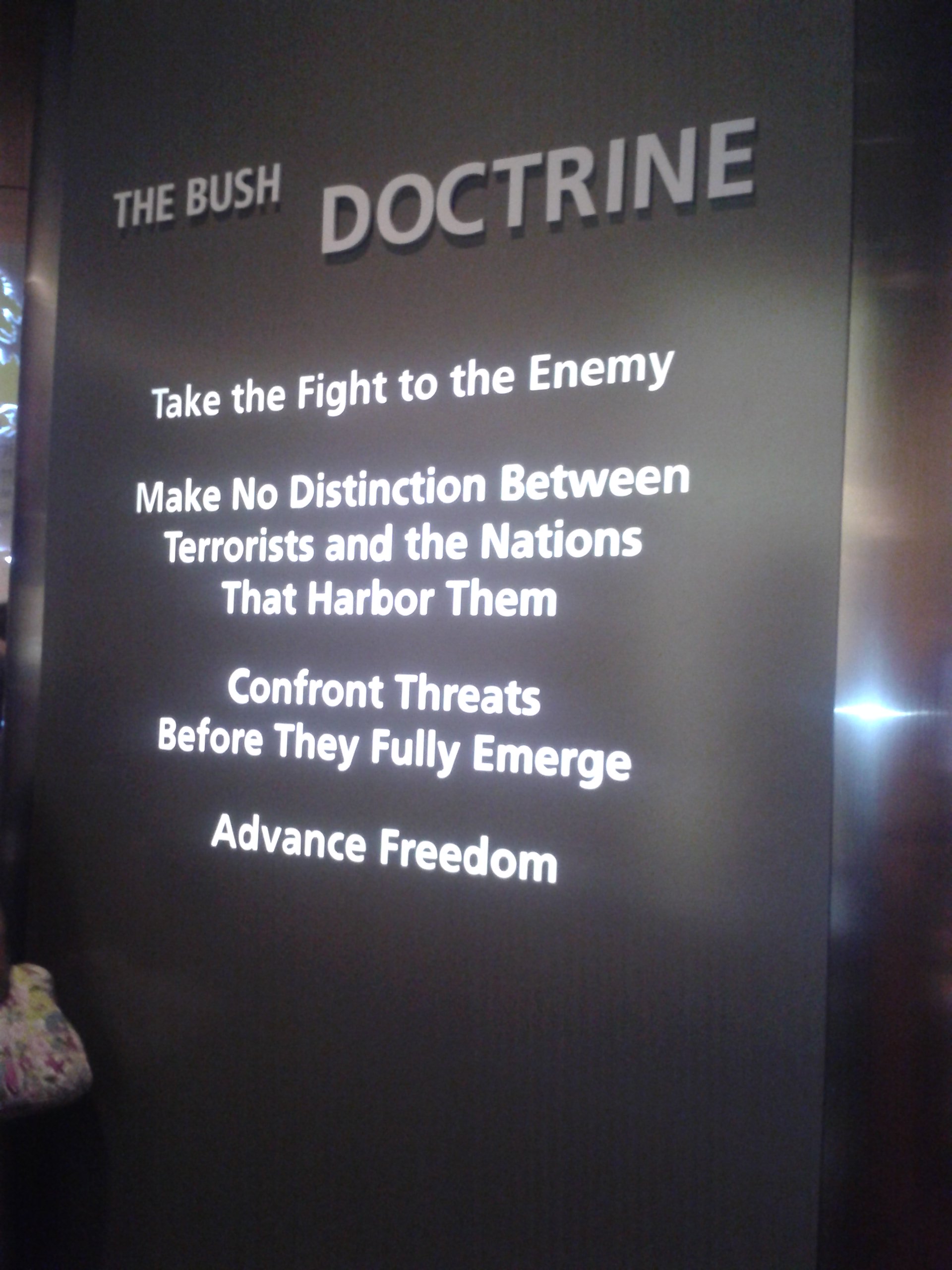 The George W. Bush Presidential Library is on the grounds of a private university (Southern Methodist in Dallas), costs $16 for an adult admission (well, really it’s $21 because of the $5 parking fee, unless of course you want your car to be valet parked, in which case you’ll be shelling out $15) and is monitored by armed security guards and TSA-style X-ray machine at the entrance.