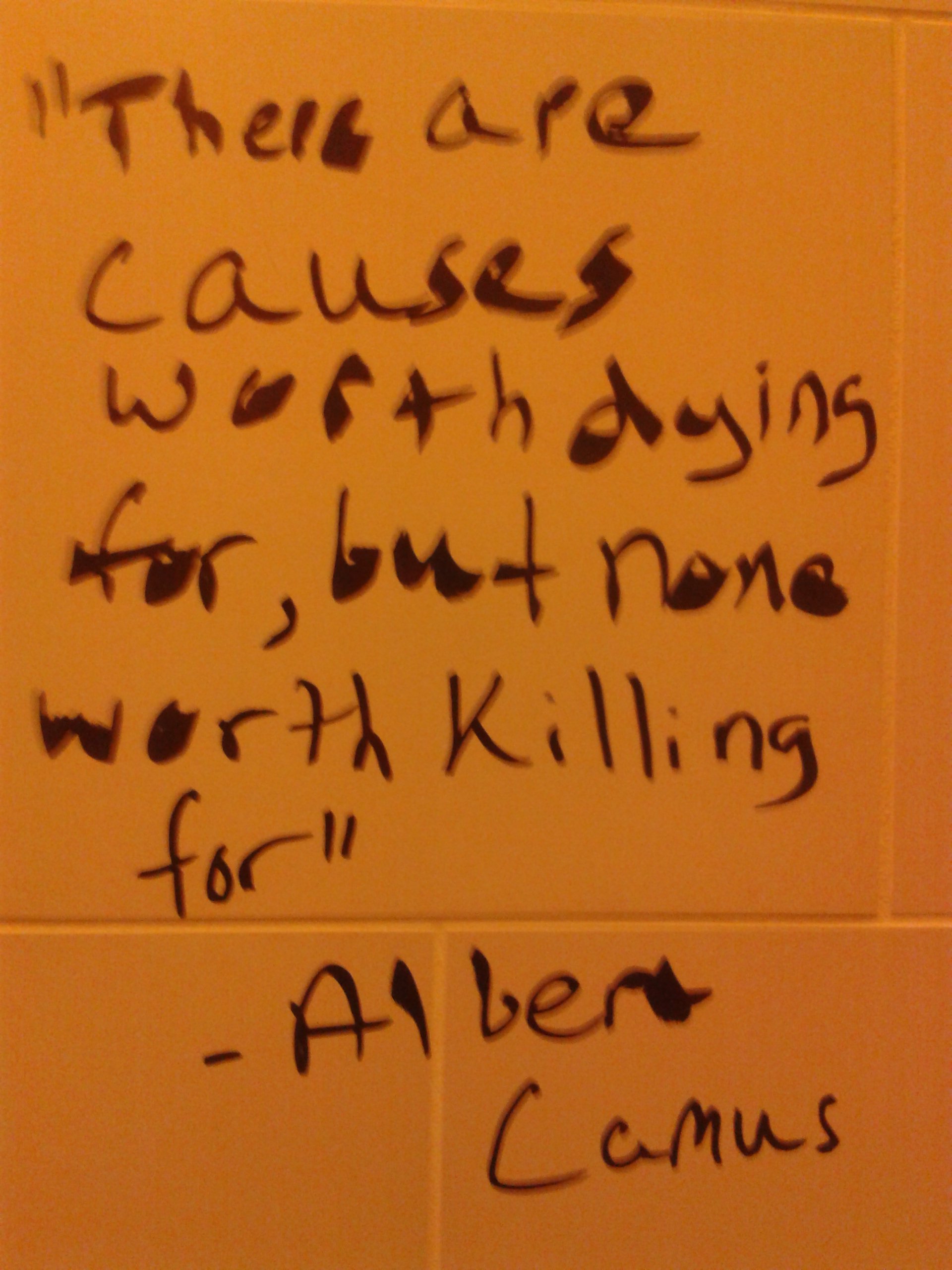 Some ne’er-do-well wrote this in the men’s bathroom at The GWB Presidential Library. I know what you’re all thinking and no…no, I do not think Dubya knows who Albert Camus is.