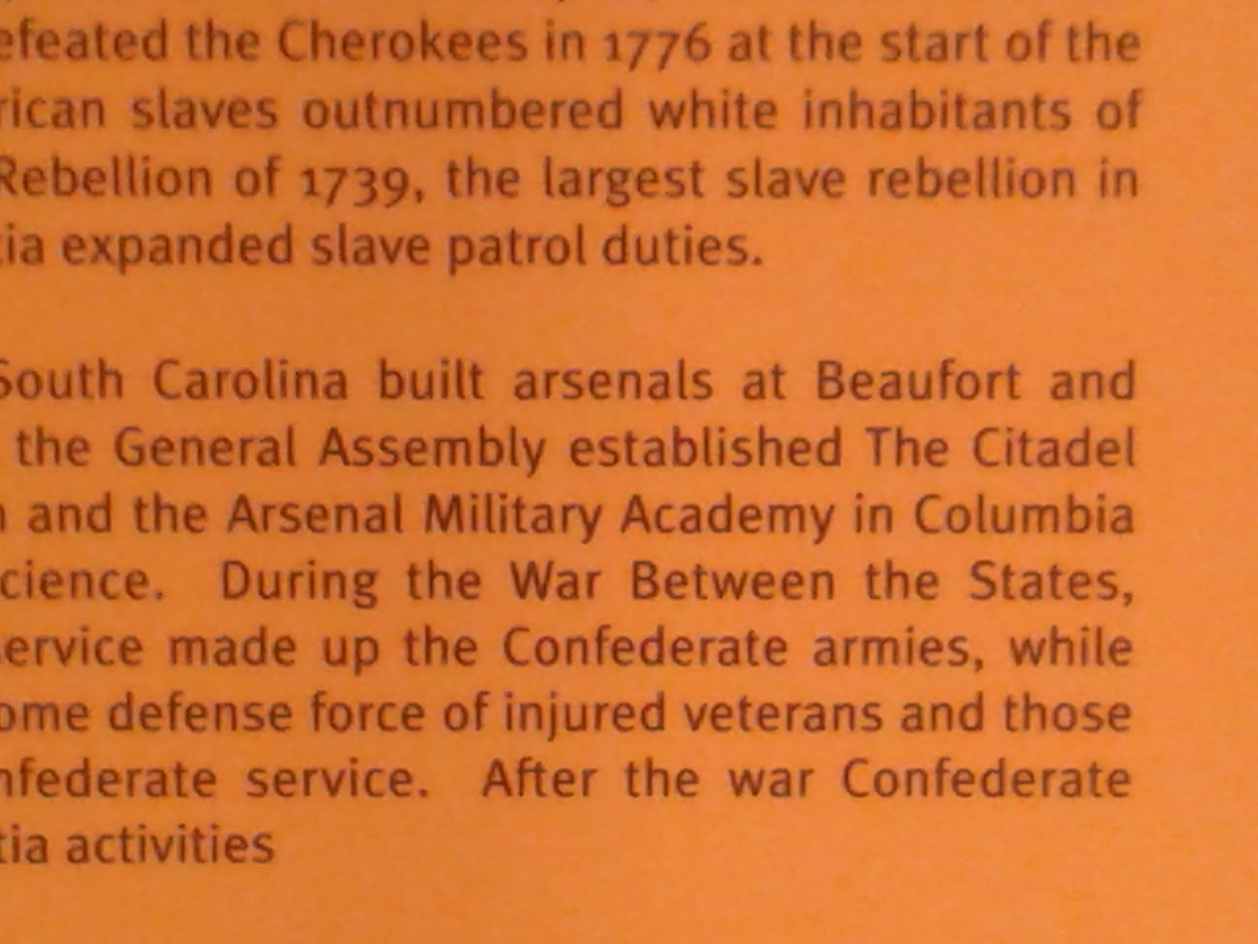 The pictures for today contain an abnormally high number of shots of descriptive plaques and informational panels because I feel they’re necessary to grasp just how far back in the 20th Century much of South Carolina still is and how little remorse or shame they feel for a 300+ year legacy of slavery, segregation and systematic racial oppression, If you’re from South Carolina and would like to argue me on this point, I would say that a) I’m using your state government’s words to illustrate why I’m right and, b) your state capitol still has the damn Confederate Flag floating over it.