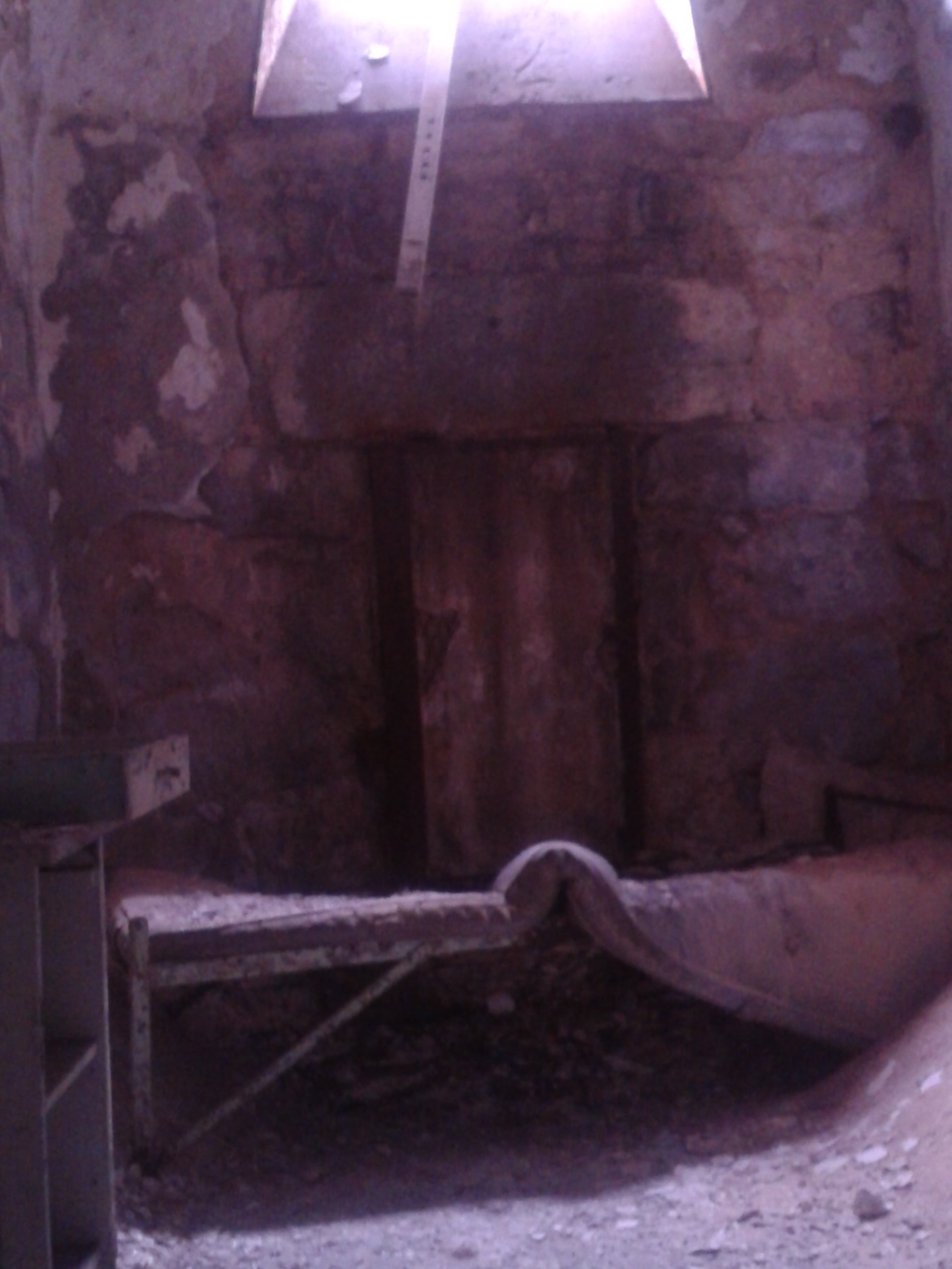 Another view of a less well-kept cell. The light you see coming from the top of the picture is natural sunlight, which is coming through a small slit that was known as The Eye of God. That was the prisoner’s only exposure to the outside world, with the exception of the 1 hour a day he was allowed to use his exercise cell, an adjoining cell that was same size as his living cell, but with an open roof.