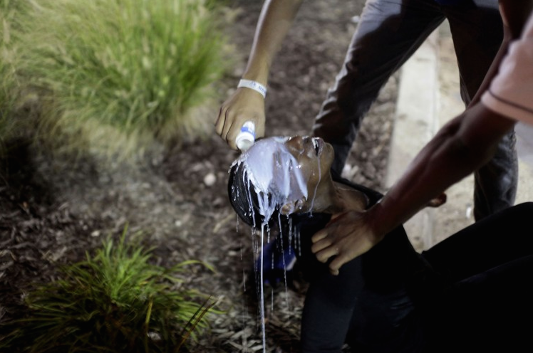 With tear gas burning a woman’s eyes, protesters pour milk on her to try and ease her pain. (Photo: Joshua Lott/Getty Images)