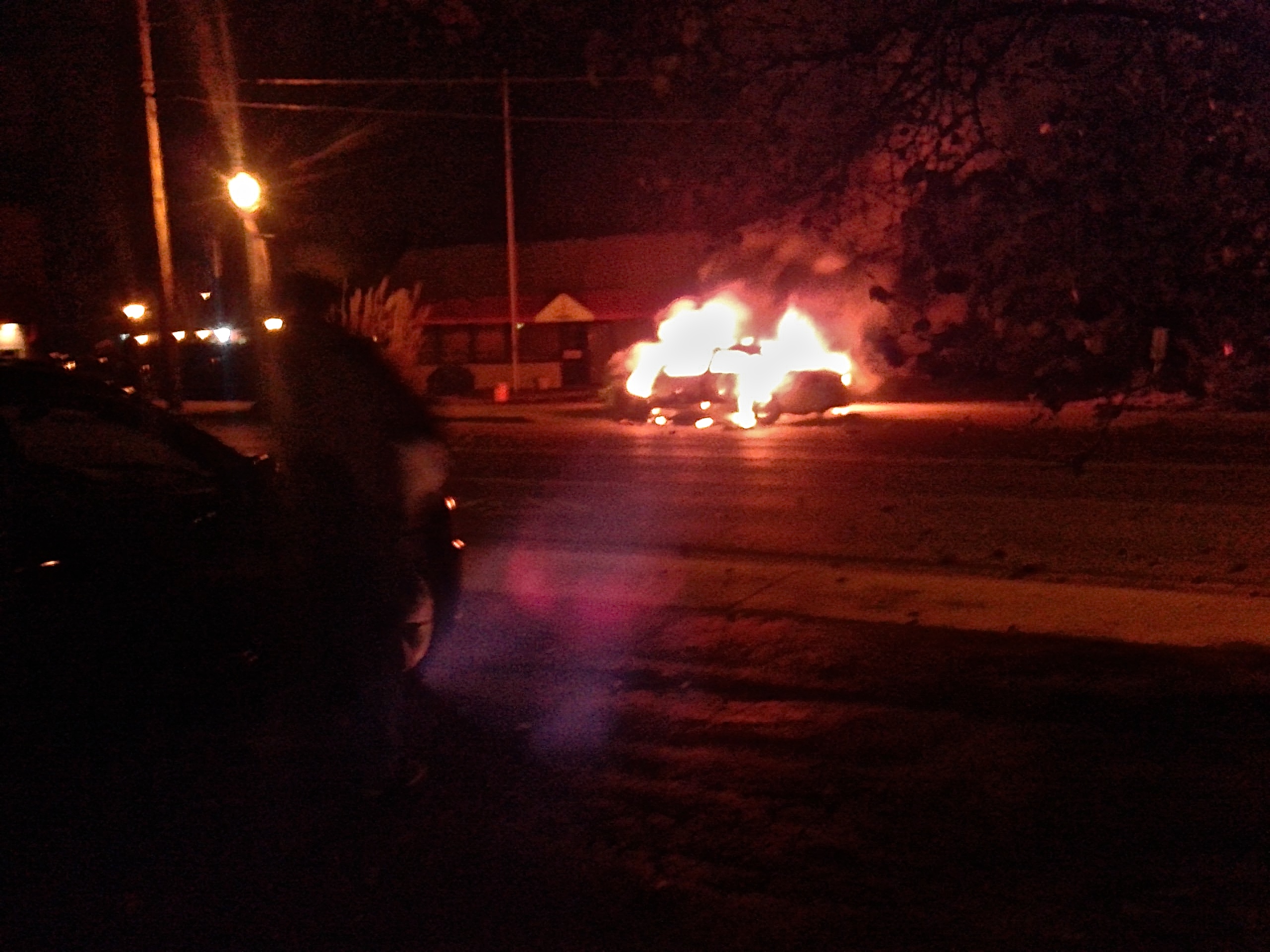 I didn’t stick around long enough to see what happened on the hill and started looping back around to see if there were still convoys of cops in front of where my car was. When I got closer to South Florrisant, I could see that there wasn’t a major police presence there, but noticed a cluster of people huddled near the sidewalk taking pictures of something. As it turned out, that something was a St Louis Metropolitan Police car that was completely engulfed in flames. About 300 feet up the street there was another cop car that had a small fire going on it’s roof, but the one the sat in front of me was just one big orange fireball. And it was directly between me and my car. After a couple minutes of hedging, wondering if the car might blow up dramatically in my face like in some Jerry Bruckheimer movie, I ran across the street and hopped into my car.