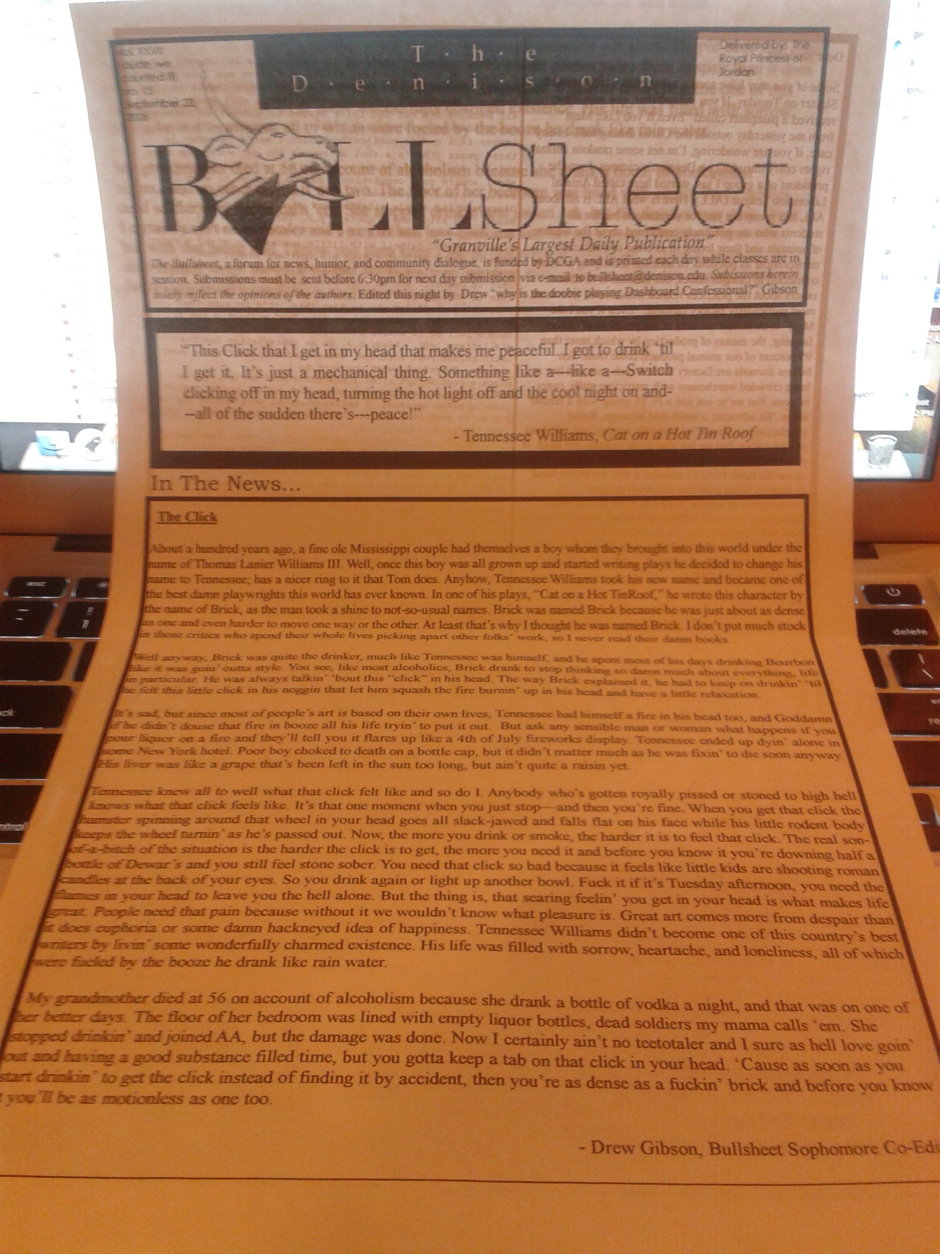 The Bullsheet was the alternative daily paper at Denison University, small liberal arts college in central Ohio that I attended for about a year before being politely asked to leave and told to never come back to again. Generally, the school was a upper-middle class bubble of wanton WASPiness located in the middle of nowhere and I wasn’t too terribly crushed to leave, but I was–and am–saddened by the fact that I had to leave my post as an editor of The Bullsheet, as it was the greatest gig I have ever had. Every Thursday night, I would ride up to the 4th floor of the school’s student union and open up The Bullsheet office, which was decorated with un-filed back issues, tens of empty liquor bottles and a wall dedicated to displaying the clippings of the times an editor had found his or her way into The Denisonian–the school’s horrifically boring paper of record–in their page devoted to student arrests.