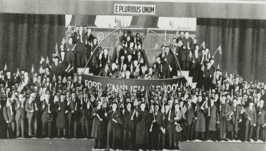 In the early portion of the 20th century, Henry Ford established a number of different tools to facilitate the “Americanization” of his largely Mediterranean and Eastern European workforce, one of which was the Ford English School, a place where foreign workers could be divested of their own customs and inculcated in American language and culture. In these schools, immigrant workers not only learned the English language, but were forced to adopt dominant, white cultural mores in every aspect of their lives from table manners to spending habits. Upon completion of the program, all of the workers were included in what amounted to a graduation pageant, where all of the immigrants walked off of a “boat” on one side of a stage wearing their native dress, down a gangplank and into an actual, giant melting pot, which was being pantomime stirred by the school’s faculty with giant oars. After all of the workers were in the pot and the teachers had mock-mixed its contents enough, they all walked out the other side, dressed in traditional American garb and waving Old Glory back and forth like their life depended on it. They had been reborn in the image of their bosses and, more perhaps more importantly, their money. E Plurbus Unum – Out of Many, One.