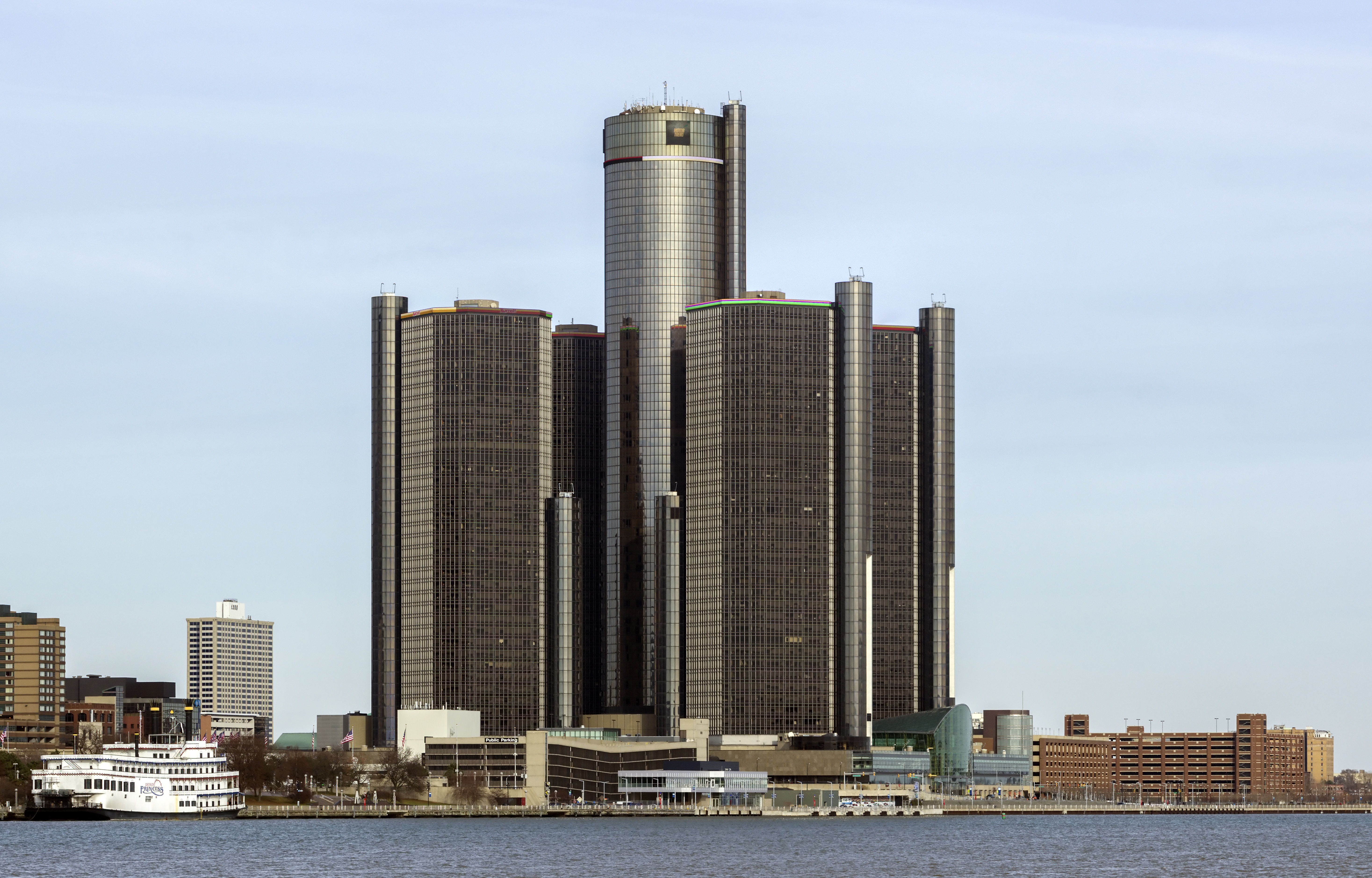 The GM Renaissance Center as seen from the other side of the Detroit River