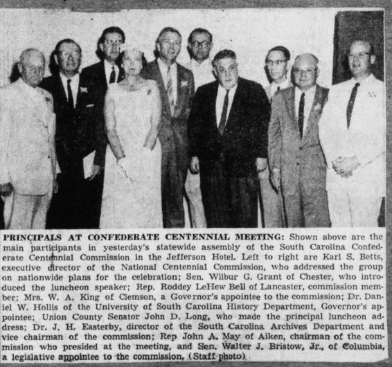 Any doubts one might have about the reasons behind the hoisting of the Confederate flag outside the Statehouse should be allayed by remarks given by Senator John D. Long on the occasion of the centennial at the then still segregated Francis Marion Hotel in Charleston. On that evening in 1961, Long gave the crowd before him a brief synopsis of his perceived history of the post-Civil War South, telling them that, “Out of the dust and ashes of War with its attendant destruction and woe, came Reconstruction more insidious than war and equally evil in consequences, until the prostrate South staggered to her knees assisted by the original Ku Klux Klan and the Red Shirts who redeemed the South and restored her to her own.”
